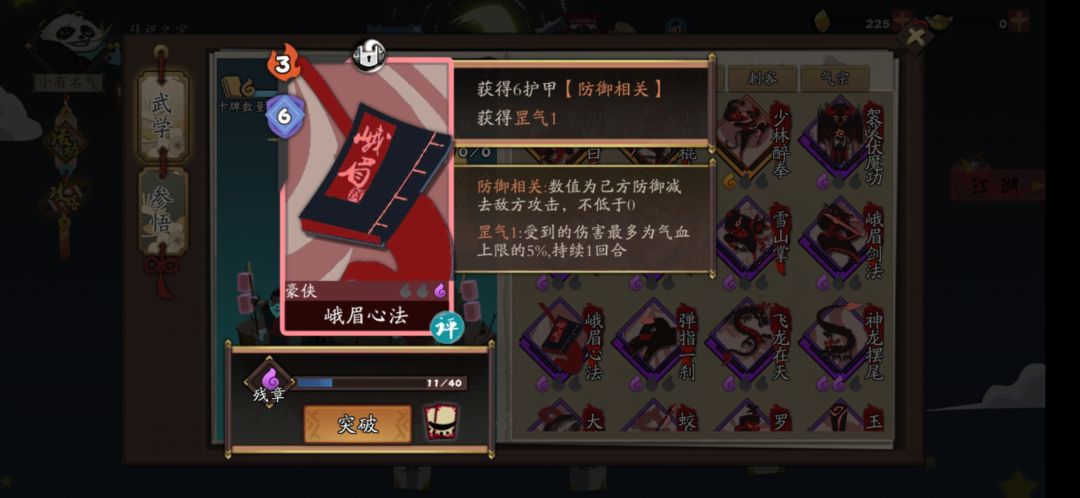 总体卡组的话,输出有峨眉剑法和大剪刀,配合上一些自残牌,伤害基本够用,唯一牌基本上都会有一些护甲或者属性,性价比也不错,但总体卡组越简单越好,标准是保证每次抓牌,抓不到金钟罩也要抓到峨眉心法,保证不会被秒。