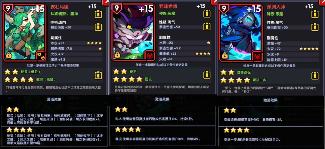 深渊大师大家都了解,二星技能是反向提升,没4星就不带。其实爆伤2星大师也可以带,减去你25爆伤你还有25爆伤并且增加了10%暴击率很棒,4星就更完美了,每1点暴击值转化为攻击力,也就是说不管你暴击值有没有溢出,在4星大师面前,都有用。