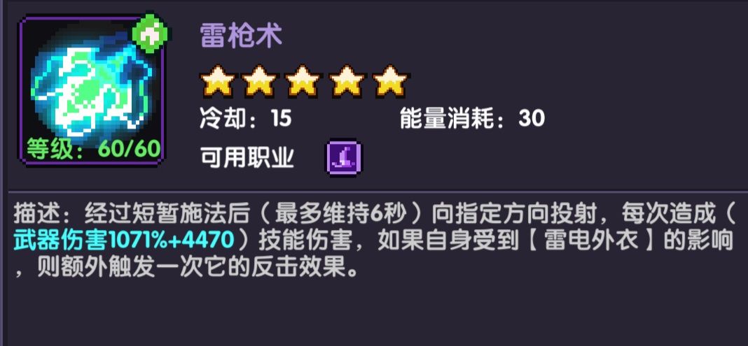 雷衣这个技能也非常的哈拉所,强有力的控制手段,提升自身移速,增加自身护甲,并且搭配流血头会对身边的怪物持续释放闪电。雷枪攻击目标也会触发雷衣的闪电效果,但由于雷枪术改版,三段伤害整合为一段,所以雷衣的实用性也大大降低了。总的来说还是不错的。