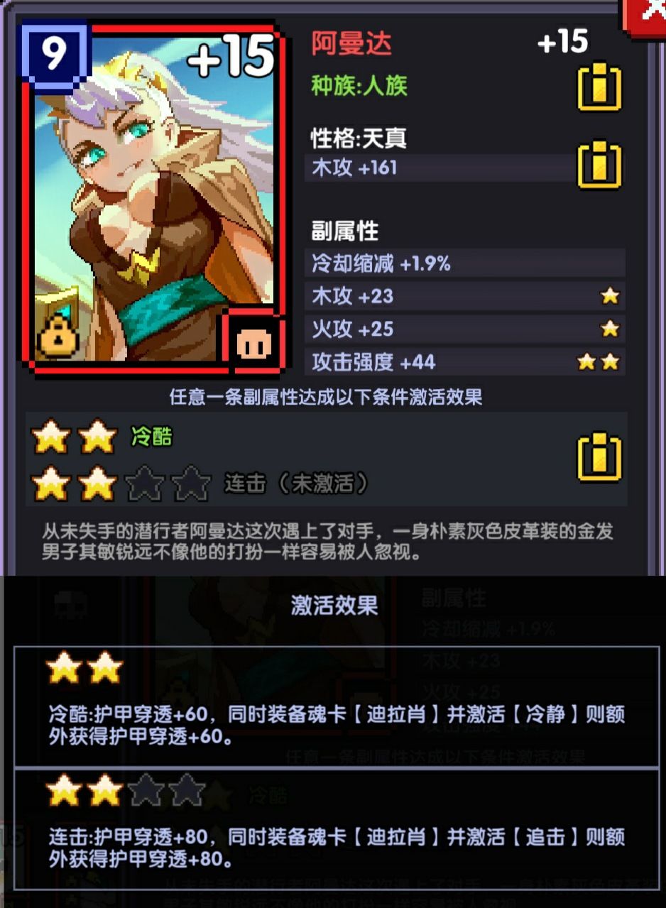 阿曼达。俗称狗女。这是一张装备魂卡。选择它的原因就是因为她的主属性有木攻这一属性,并且4星还有护穿的提升,可以说是非常biu特否的一张魂卡,但是狗女只能在商城的魂卡商店里刷新买到,27万金币买一张主属性还不一定是木攻,所以不要盲目去赌。曾经为了它,让本不富裕的我更是雪上加霜😐