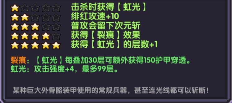 绯红别名毕服剑。基础属性超高,51.5的爆伤,1135的穿甲,31的首伤让这把剑闪闪发光,再看看技能,每层虹光+4攻强,每30层虹光额外获得150穿甲,那么99层是多少,那可是396攻强和450穿甲!黑马!但你们别高兴太早,这玩意儿可不好弄😎工会打裂隙boss才会给你碎片😎。不过努力就有希望,加油!