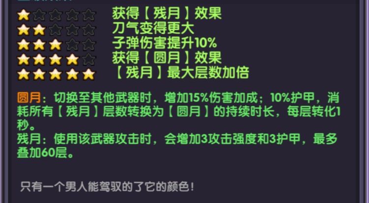 龙刀的效果是每次攻击会增加3攻击强度和3护甲,最多叠加60层。攻强提升的伤害是本质的,爆伤首伤穿甲属攻这些我个人觉得只是在攻强本质伤害上提升本质的伤害,所以攻强还是很香的。5星之后就可以叠到60层残月(4星只有30层)60层残月就是180的攻强和180的护甲,最重要的不是这个,而是切换其他武器后会触发圆月效果,15%的伤害加成和百分之10的护甲!每层残月可以转化一秒的圆月,60层就是一分钟了。其实说了这么多,龙刀的技能其实属于一般偏优,最重要的是龙刀的属性,1223超高穿甲让龙刀在武器穿甲属性中夺魁,36.3%的首伤,40.4的爆伤更是给龙刀锦上添花。