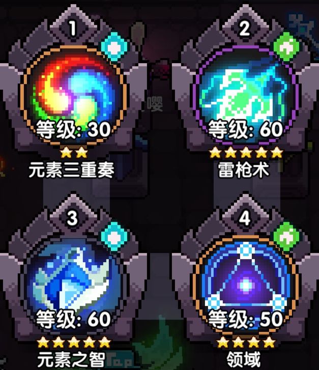 这两个技能初期建议带雷衣,当你的雷枪4星之后伤害高了就可以带元素之智了。