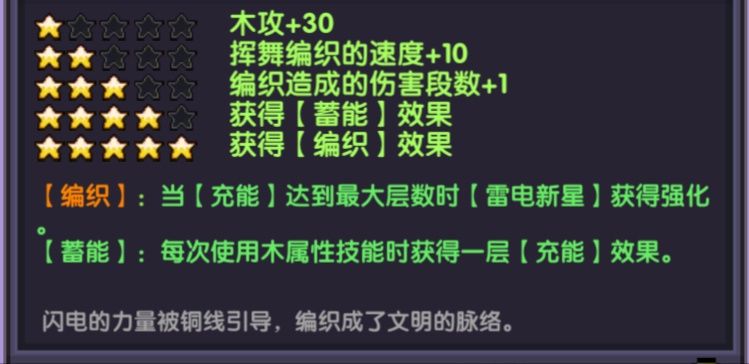 编织这把武器是雷法转电法的核心武器,我建议玩雷法的伙伴们人手五星编织。编织的技能和效果对雷法来说没有一点用,一星的木攻增加30也只是主手才有效果。但强就强在编织的属性很好,51.5的超高暴击伤害和240木攻1135穿甲让它超凡脱俗,很适合作为撑面板的副手武器。