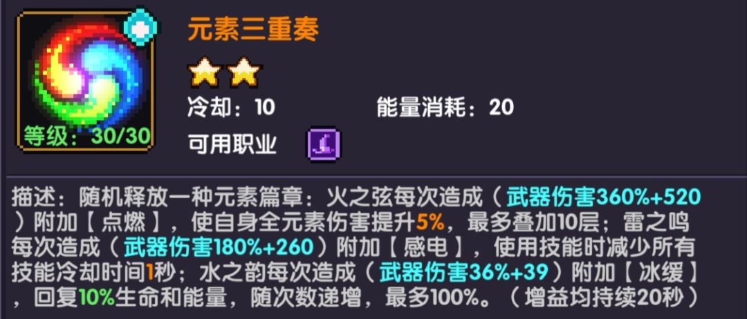 元素三重奏这个技能不需要考虑等级,一级一星都可以用,我们需要的是它的火之弦效果,火之弦会让你的伤害提高数倍,也可以让你的伤害没有任何提高,就相当于你带了一个没用的技能,这一切就看火之弦的能叠多少层了。