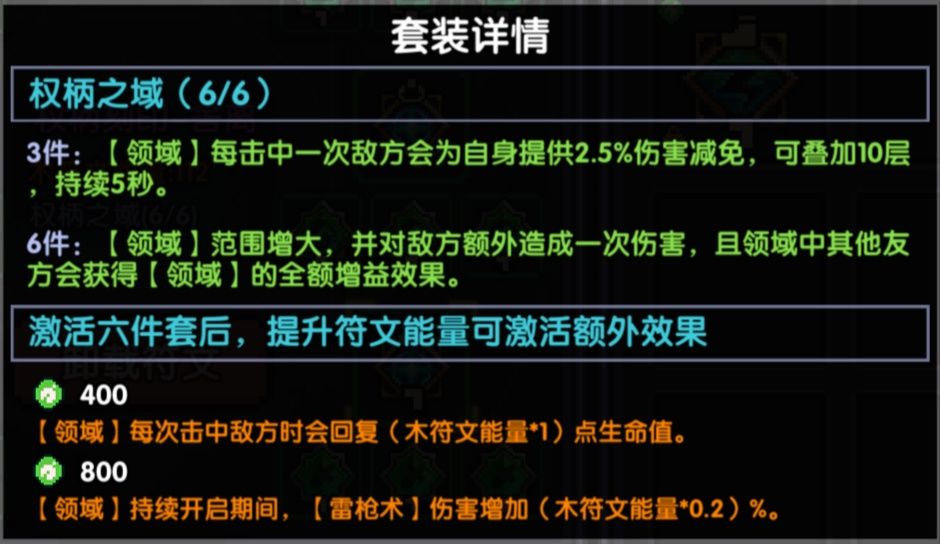 这套权柄之域符文就是雷法的专属符文。三件效果是每击中一次敌方就可以给自己提供2.5%的伤害减免,最多可以叠加10层,也就是25%的伤害减免,可以说是强的🦆匹。