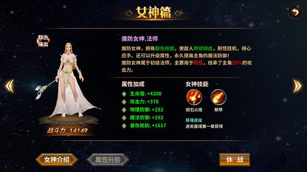 不同的女神自带不同的技能,同时还给你提供不同的属性加成,比如命中女神·战士可以增加10%经验加成,而魔防女神·法师则增加5%基础攻击力,具体是让哪位女神出战,就要看你的喜好了。
