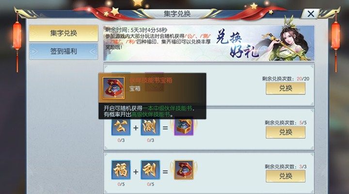 同时集齐5张公测福印之“福”和“利”,可以兑换伙伴技能书宝箱*1.活动期间一共可以兑换3次。