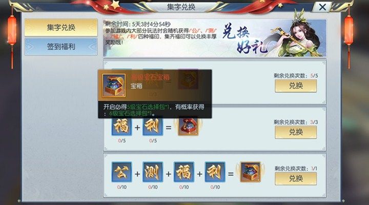 同时集齐10张公测福印之“公”、“测”、“福”、“利”,可以兑换高级宝石宝箱*1,活动期间只能兑换一次。