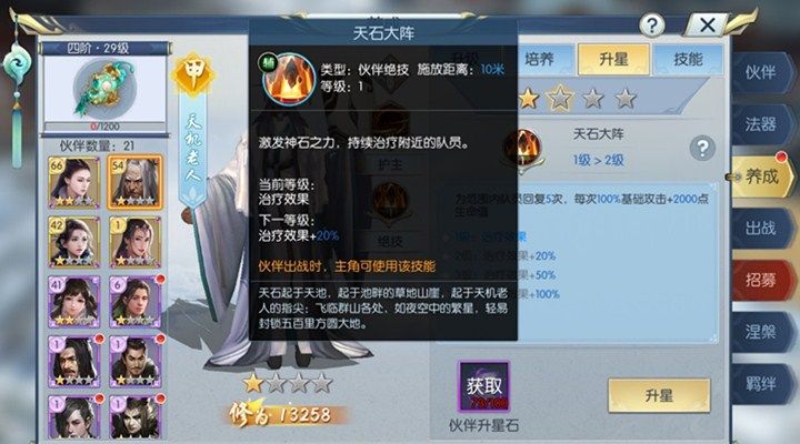 通过伙伴升星可以提高天机老人的伙伴绝技等级,伙伴自身初始伙伴绝技等级为1级,第一次我们可以通过使用100个升星石对其进行升星,升星后的效果是让治疗效果增加20%,就好比天机老人基础攻击为1000,他的初始恢复血量就是100%基础攻击等量的血量+2000,每次回复3000血量,一共回复五次,回复15000的血量,而伙伴绝技等级升星到2级之后的治疗效果提升20%,就会使血量总回复量达到18000,提升的回复量还是挺高的,在伙伴绝技达到2级之后再进行升星提升绝技技能等级除了伙伴升星石还需要准备好天机老人的专属武器神石天书,在天机老人的伙伴绝技达到4级的时候,可以使治疗效果提升100%。那个时候所能恢复的血量是相当可观的。有一点需要注意的是,天机老人的绝技治疗效果除了通过升星提高绝技等级来提升,还可以在培养的时候先把智力点满,这样可以增加他的基础攻击力,相应的也就增加了等量于基础攻击力的生命回复。