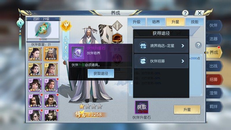 伙伴升星石我们可以通过境界商店—定星进行购买,或者通过伙伴招募获得,当然摆摊上也可以直接购买的到。而天机老人的伙伴专武神石天书通过秘宝星图的挖掘有概率获得,或者花费金币通过摆摊购买。当然也可以通过伙伴招募里的金币招募获取光阴卷再去兑换甲级专武选择礼包。