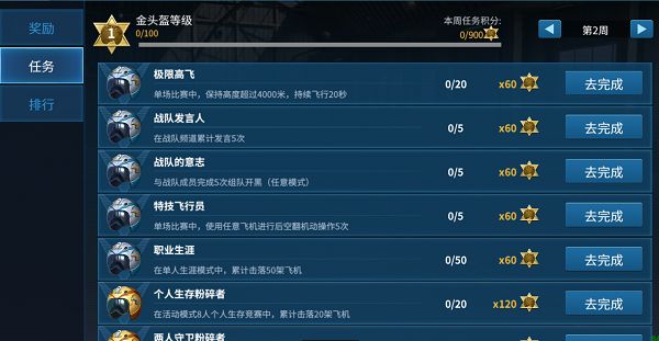 白银版任务每个80积分,每周5个共计400积分;黄金版任务每个120积分,每周5个共计600积分。金头盔每升一级需要100积分,因此一周任务全部做完可以升10级,金头盔赛季总共10周刚好100级。