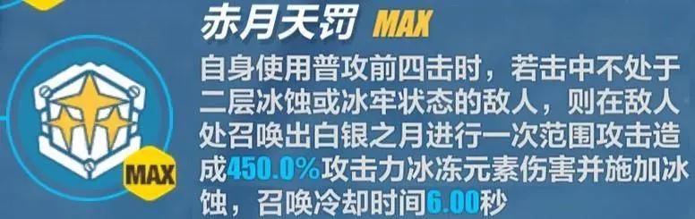 普通状态期间,通过赤月天罚、白月留影、普攻的第五击即可召唤白银之月,之后白银之月的攻击会给范围敌人施加一层冰蚀。