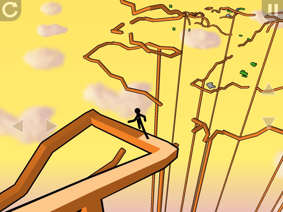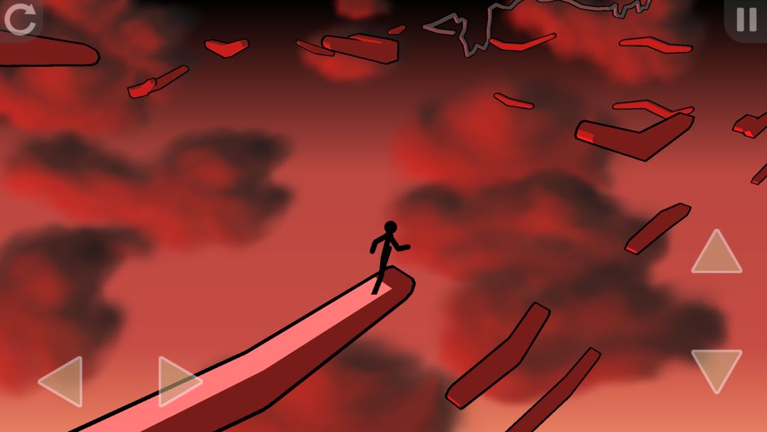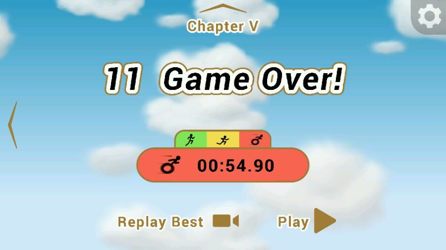 《Skyturns》在玩起来,会有另一个难点,火柴人在无障碍地奔跑一段时间,就会匀速加速,这与跨栏、短跑等运动是一个道理,因为这个设计,可又虐惨了手残党。原本操作跳一下,可能因为加速后奔跑距离过远而大步跳进深渊。反复尝试对于每个起跳点的大致判断,和落地后左右点选的机敏程度,成为过关的重要因素。