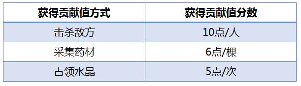 贡献值的获取方式:击杀敌方、占领水晶和采集药材。