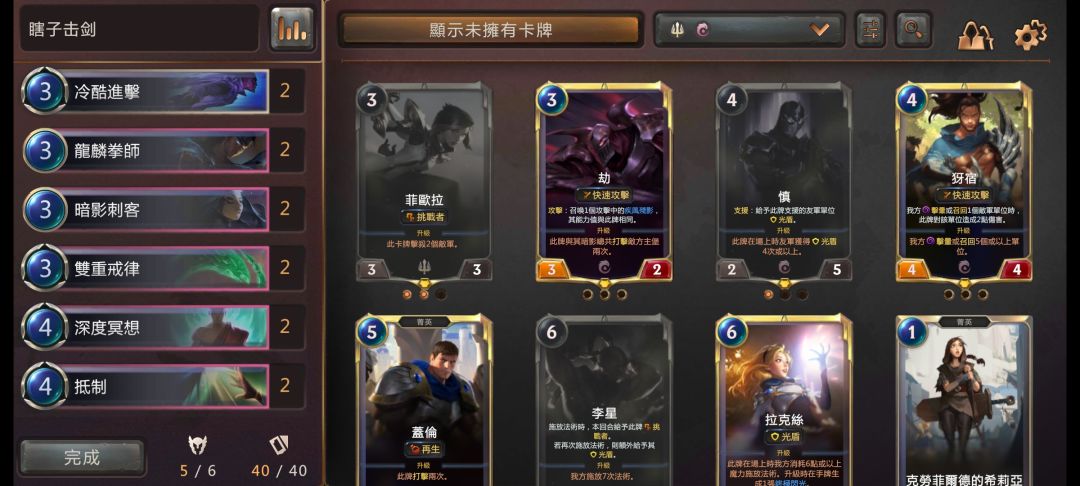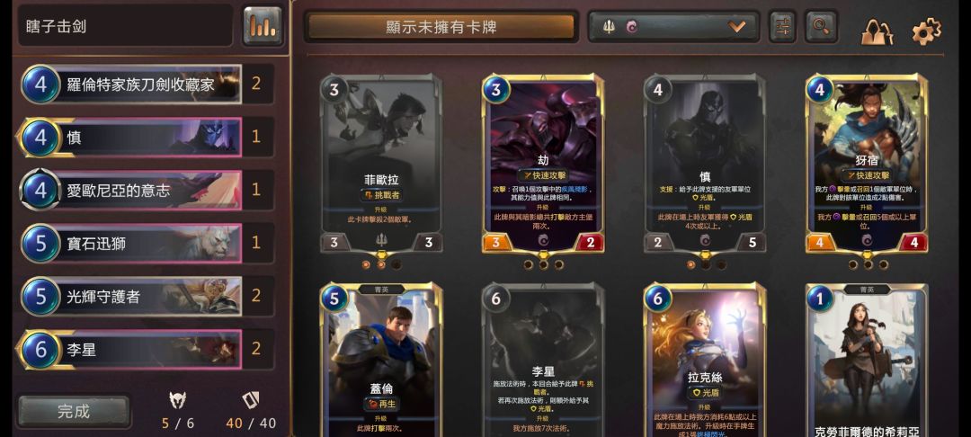 我这卡组怎么样,游侠决心打算换成剑姬或者慎,目前没有尘。c位有好几个,剑姬,瞎子,还有光辉守护者,实在不行任意养起来一个都很强。法术基本上都是低费,过牌也多,虽然有20个法术,但我觉得不是很卡手,有什么问题欢迎指出,讨论一下。