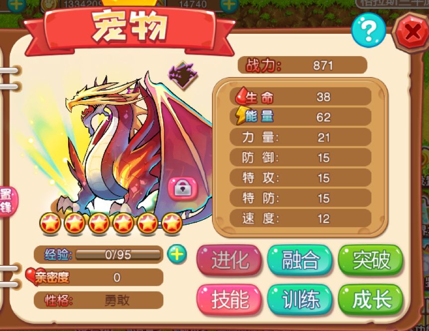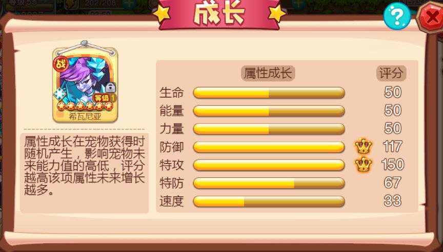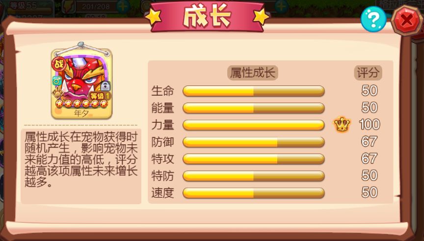 整体属性综合值非常高的宠物,参加连续充值活动满7天就能拥有。野兽系六星紫色稀有品质,自带双天赋,成长性格均固定,是大陆上极其稀少的残暴神兽。比较实在的是年夕可以通过幼夕进化得来,而幼夕是可以捕捉到的,不过从进化而来的年夕,成长性格天赋并不固定,就要看捕捉幼夕的资质了。