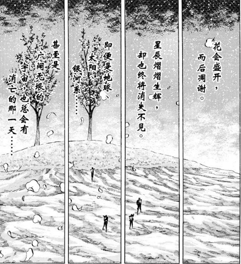 “花会盛开,而后凋谢。星辰熠熠生辉,却也终将消失不见。即便是地球、太阳、银河系......甚至是广阔无垠的宇宙,也总会有消亡的那一天。” ——沙加