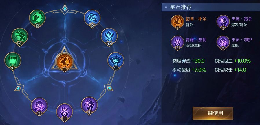 蓝绿星石主要是物理攻击、物理穿透、物理吸血和移动速度四种。紫色星石推荐天鹰,青藤,水灵,提升打野的续航,以及战斗时的生存和爆发力,橙色星石选择猎隼,进一步加强斩杀能力。