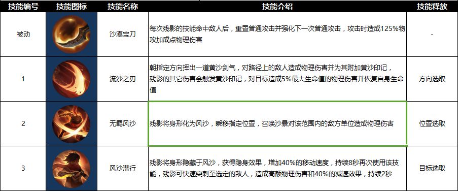 1、被动沙漠宝刀,残影的技能命中后,重置并强化下一次普攻,造成额外伤害,因此残影在释放技能后尽量接一次普攻。