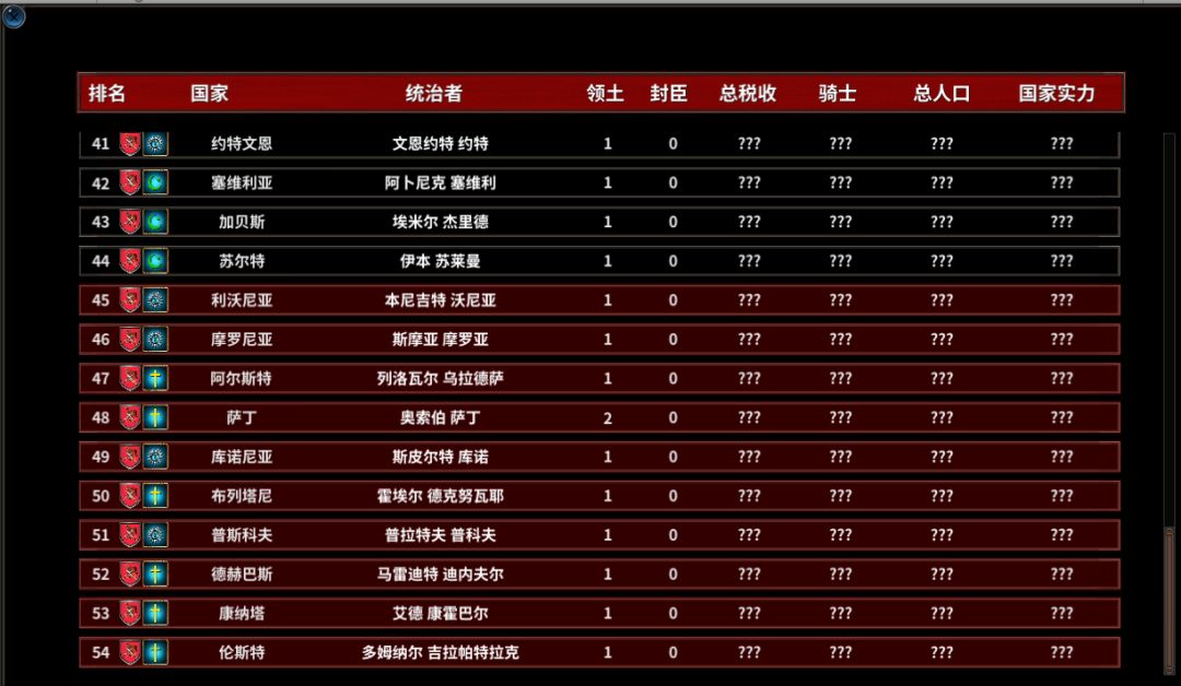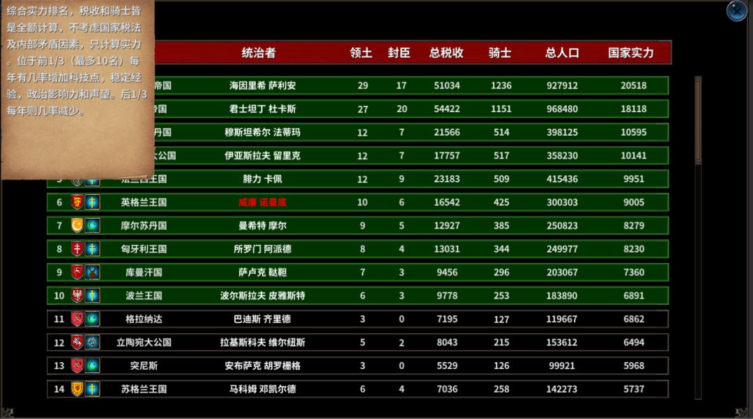 排名统计将显示目前存在的独立国家,包括王国,帝国以及小的独立领主。