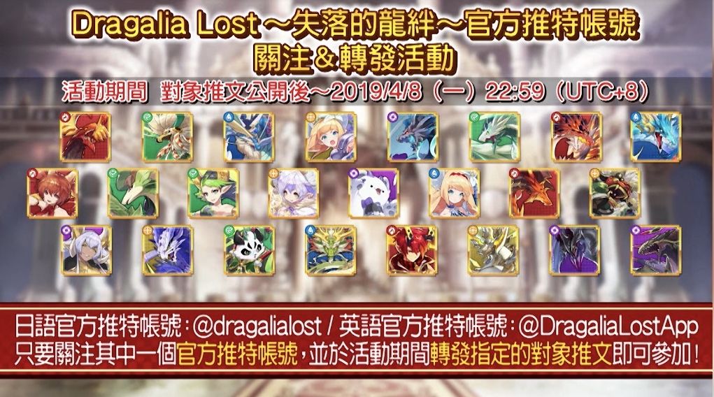 除此之外,也將舉辦《Dragalia Lost ~失落的龍絆~》官方推特帳號關注 & 轉發活動,預計將贈送 10 名玩家所有 ★5 龍族各一隻,並抽選 100 位玩家贈送 1 隻喜愛的龍族,活動詳情請參考官方公告。