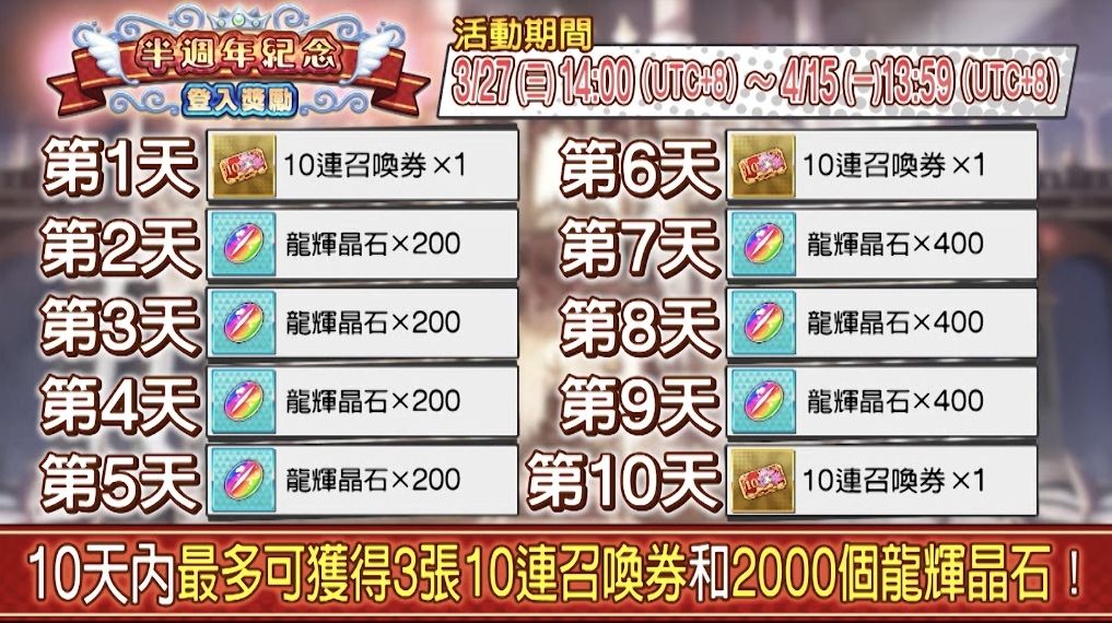 官方於《Dragalia Lost ~失落的龍絆~》【那姆頻道 2019.3.26】影片中表示,將於 3 月 27 日 14 : 00 至 4 月 15 日 13 : 59 舉辦半周年紀念登入獎勵,玩家在 10 天內最多可以獲得 3 張 10 連召喚券和 2000 個龍輝晶石。