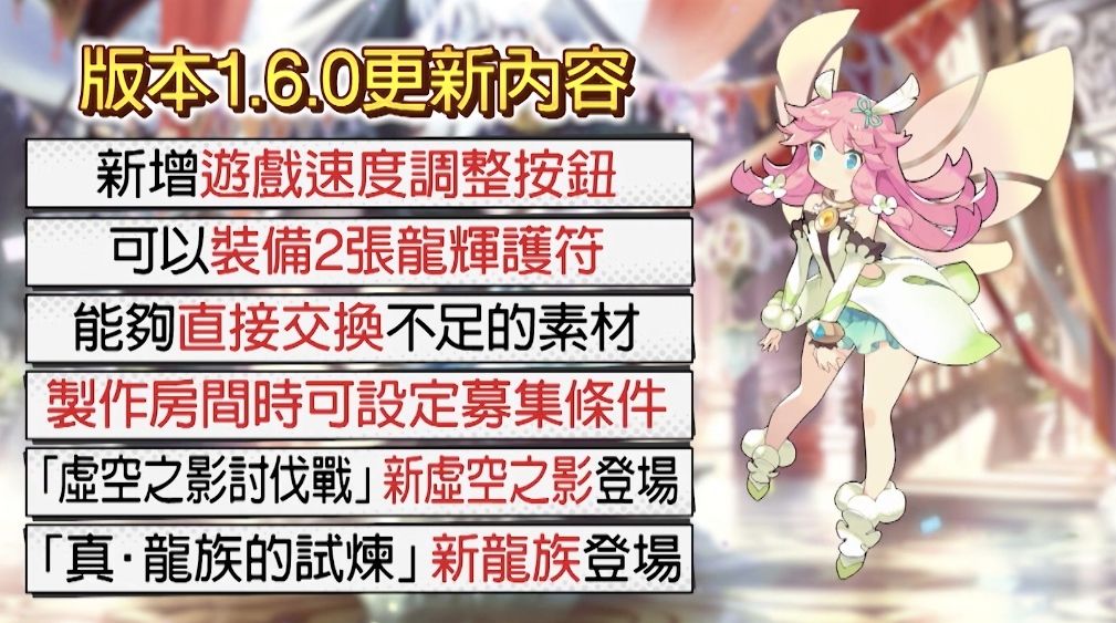 在更新方面,官方也在 1.6.0 版本推出更新內容,包括新增遊戲速度調整按鈕、裝備 2 張龍輝護符、直接交換不夠的素材、設定房間募集條件以及新的「虛空之影討伐戰」、「真·龍族的試煉」內容。