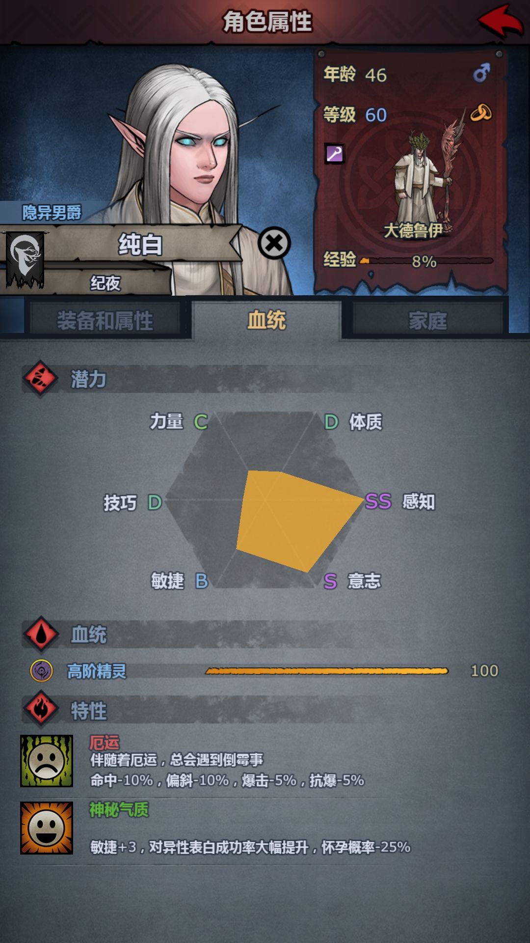 相貌特征,黑色的眼睛。(感知+5命中-40%表白提升,怀孕-25%)
