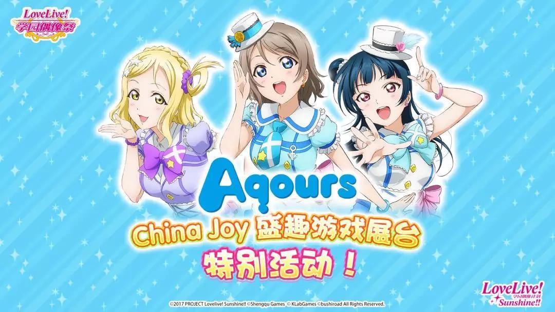 Aqours的三名成员:齐藤朱夏(饰 渡边曜)、小林爱香(饰 津岛善子)、铃木爱奈(饰 小原鞠莉)将会亲临China Joy的盛趣游戏主舞台举行特别活动,并于ChinaJoy期间进行《Love Live! 学园偶像祭》特别生放送哦!