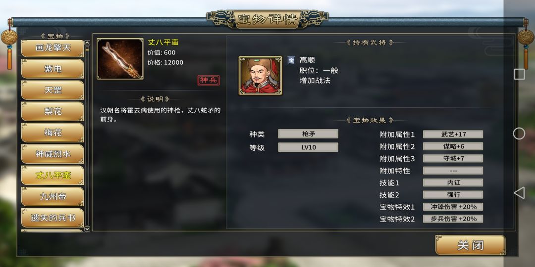 最强枪兵神器描述:武艺+20 勇猛/攻城/冷静等+10,冲锋伤害、枪兵伤害+20%。这个没枪兵10那一项倒是容易刷。