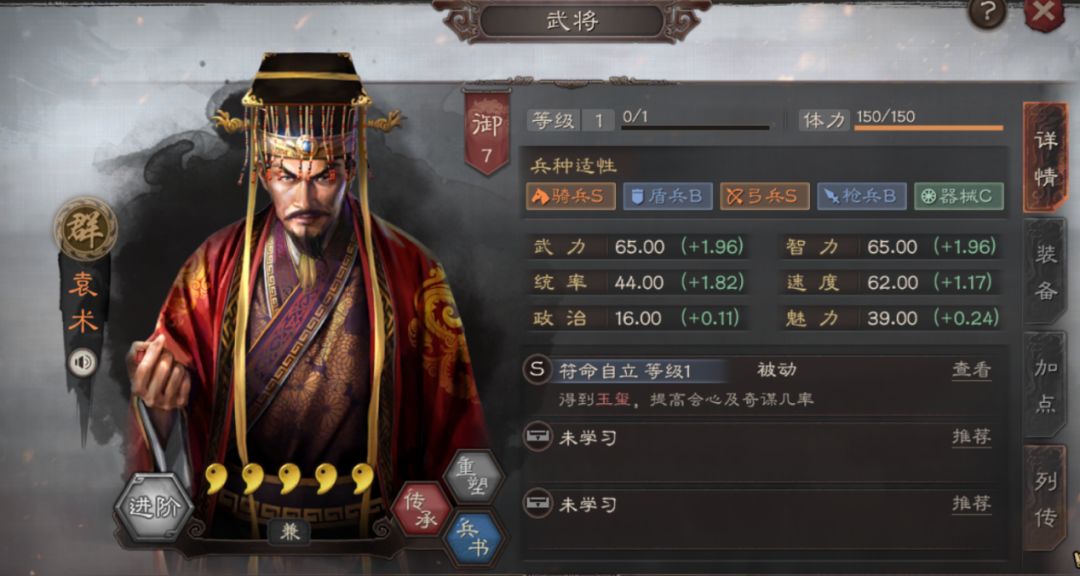 初始属性极低,但成长相当不错,武力、智力的初始属性和成长值一模一样,这样的属性在游戏中也是独一份了。弓、骑双S,意味着袁术可组弓兵或骑兵。