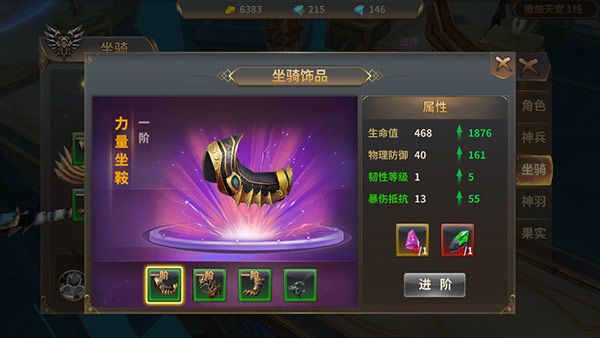 同时,坐骑还配备有坐鞍、缰绳、蹄铁、脚蹬四个饰品,消耗魂兽晶和坐骑资材升级饰品,可以大幅度增加坐骑属性。