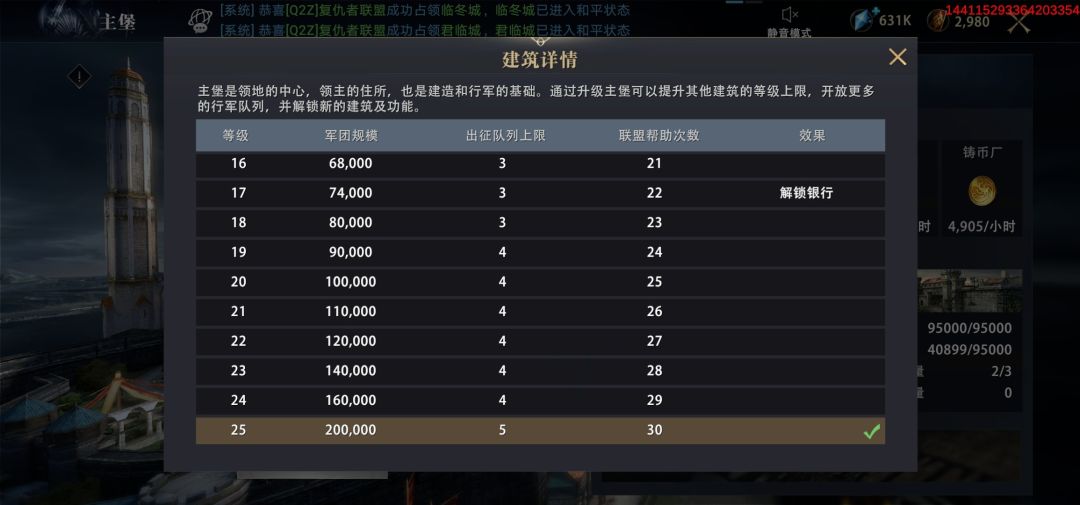 不同主堡等级有着不同的出征队列上限值。其中主堡1级队列上限为1,主堡25级队列上限为5。当拥有更多的出征队列数,我们就能同一时间内派遣更多的队列前去征讨叛军,更短的时间内获得更多奖励。更多的队列也可同时用于资源采集等,有利于城堡的建设。