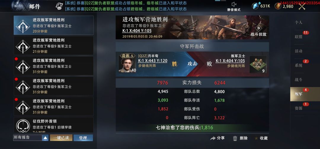 因为即使在同样胜利的情况下,“碾压敌军”时派遣队列出征会比“一场苦战”时损失更少。从下述战报的实力损失对比就可看出(上图为“碾压敌军”时,下图为“一场苦战”时)。通过派遣更高阶兵种上阵等方式可以提升我们的出征实力。