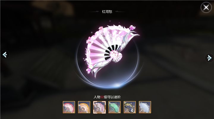 红河愁是一把紫色的扇子,紫色的扇面上有着一簇鲜花,渐渐延伸间,整把扇子的顶端都有了花枝的纹路,并在扇子的顶端开满了鲜花,甚至还有四只花朵摆脱了扇子的束缚,傲立在了空气中,这样一把扇子,仿佛打开便能闻到花朵的清香。扇子的扇骨不如前两把那么多,也正是因为这样才让上面的花纹变得清晰。有这样一把花之扇在手,青曜十三司就像是一个出游的大家闺秀一般。