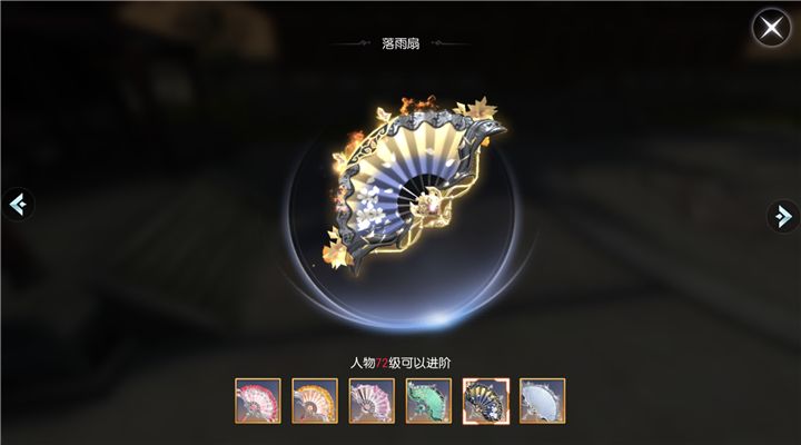 落雨扇看起来温婉大气,却又很华贵。黑色加镂空的扇框让它在大气沉稳中又多了点轻巧。黑色向橙色渐变的扇面上画着花朵和飘散的花瓣,又给了它一种别样的风情。金色的蝴蝶闪烁在扇子边上,在扇柄部的花纹也是亮橙色,前后呼应间又让人感受到它不凡的实力,这样一把折扇当真称得上是神兵了!