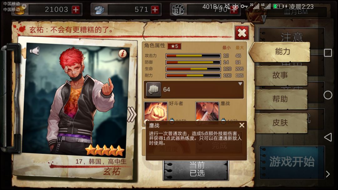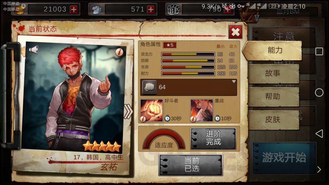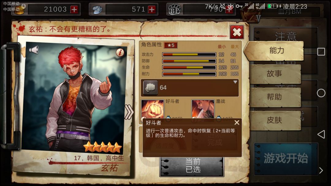 好斗者,这个就会扯到刚才没有谈的耐力与血量了。它属于被动技能,cd好了只要你打中人,那么就会回复血量与耐力。看似很少,但是如果经常打架,比赛结束时合在一起看,回复的量还是蛮可观的。