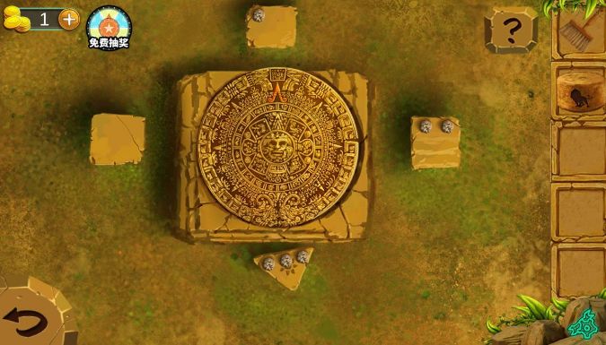 点击左前石柱获得石块,点击中间台子,使用石块。分别按下三个按钮,记住出现的笔画顺序,在正前方石像的机关上输入,获得钥匙。