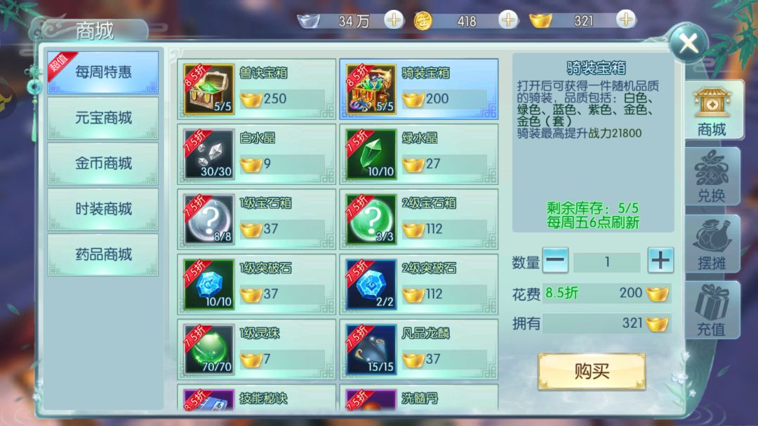 除了副本之外,还可以通过每周特惠礼包购买“骑装宝箱”,每周限购5个。