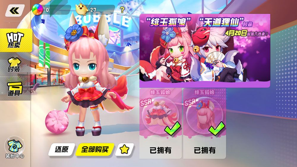 大家期待已久的全新主题地图“绯魂神社”,将在此次更新后正式实装啦!在该地图中,除了与对手斗智斗勇之外,神社的式神也会在场中徘徊,考验大家的身法与技巧噢!此外,全新的SSR时装“绯玉狐娘”、“天道狸仙”、SR泡泡皮肤“绯樱香囊”也将亮相潮人馆。