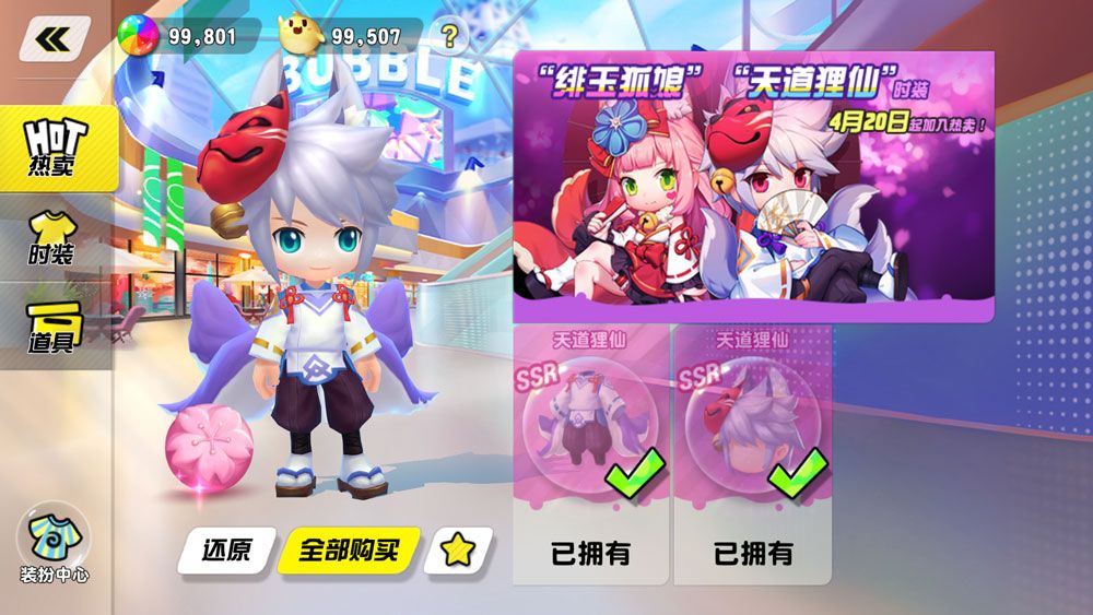 更新后,全新SSR时装“绯玉狐娘”、“天道狸仙”将会出现在潮人馆中。圆月当空,逢魔之刻,可爱的狐仙大人降临现世,与达人们一决高下!