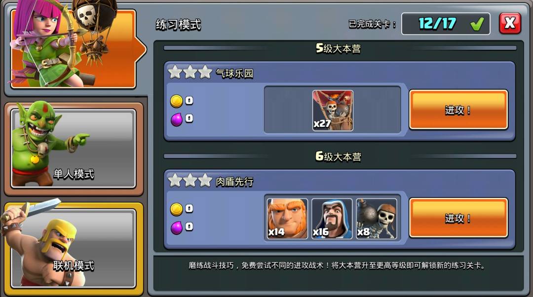 有专门为了新手准备的基本配兵和兵种练习,打过之后会给资源奖励,建议不熟悉兵种特性的玩家们,可以去多多练习。