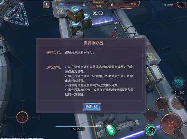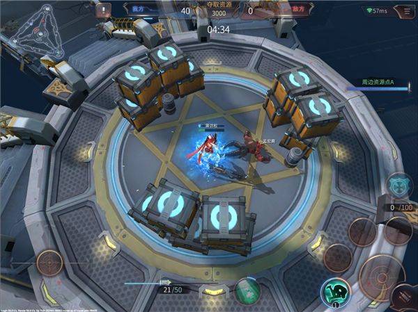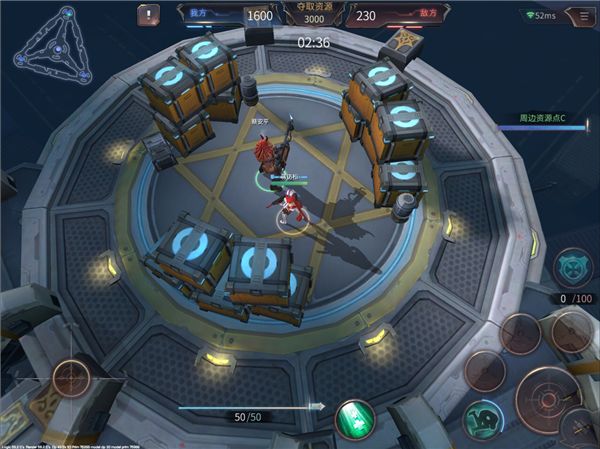 竞技场地图为三角形,三个顶点和中间的圆点是可以占领的资源点,占领点内只有一方队员的时候,才能开始占领,否则则是一种拉锯状态。在占领开始后5秒,即可完全占领这块区域,能够开始为己方产出资源。