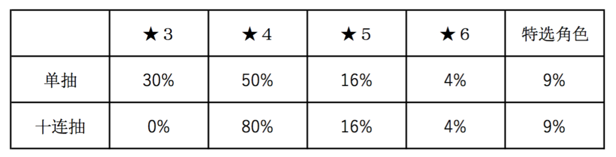 10 连抽保证出现角色★4以上。