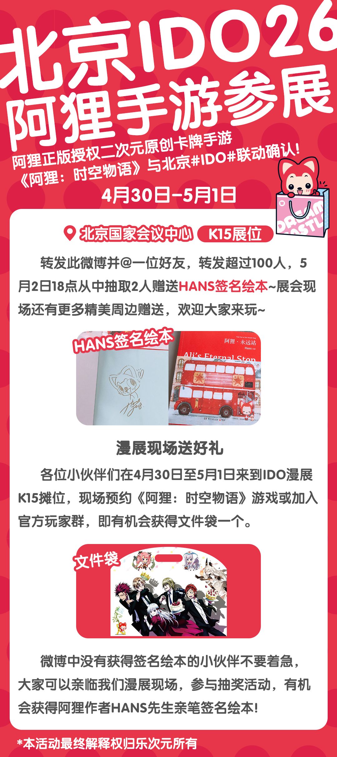今日起关注阿狸正版手游官方微博@阿狸-时空物语,转发置顶微博并@一位好友,转发超过100人,5月2日18点从中抽取2人赠送HANS签名绘本~