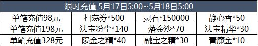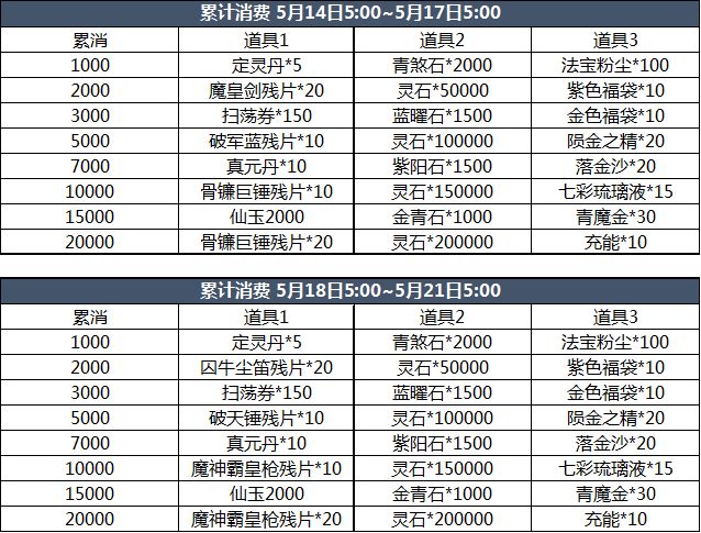 5.新增充值豪礼1(5月14日5点~5月17日5点)和充值豪礼2(5月18日5点~5月21日5点)