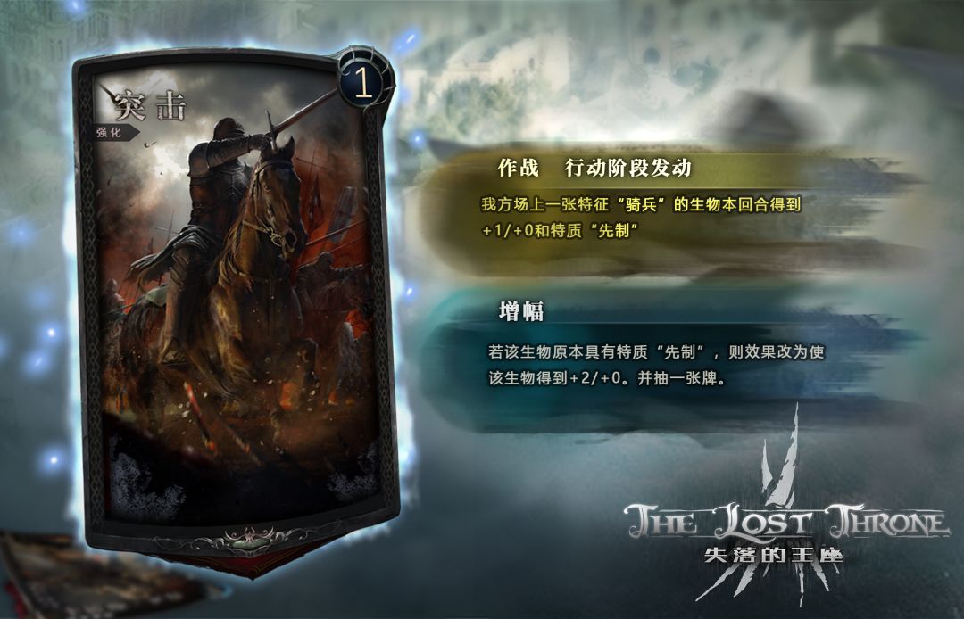 突击是一张1费用无需科技支付的强化作战卡牌,它拥有两个卡牌效果。第一个效果是使得我方场上一张特征为骑兵的单位本回合获得+1/+0和先制的特质。第二个效果则是若该生物已经拥有先制特质后该单位将获得+2/+0并抽取一张卡牌。突击作为一张骑兵专用强化卡牌没有科技限制,且一费用的消耗可以在短时间内获得强大buff,因此合理的时机使用突击很有可能一瞬之间扭转战局或者锁定胜利。