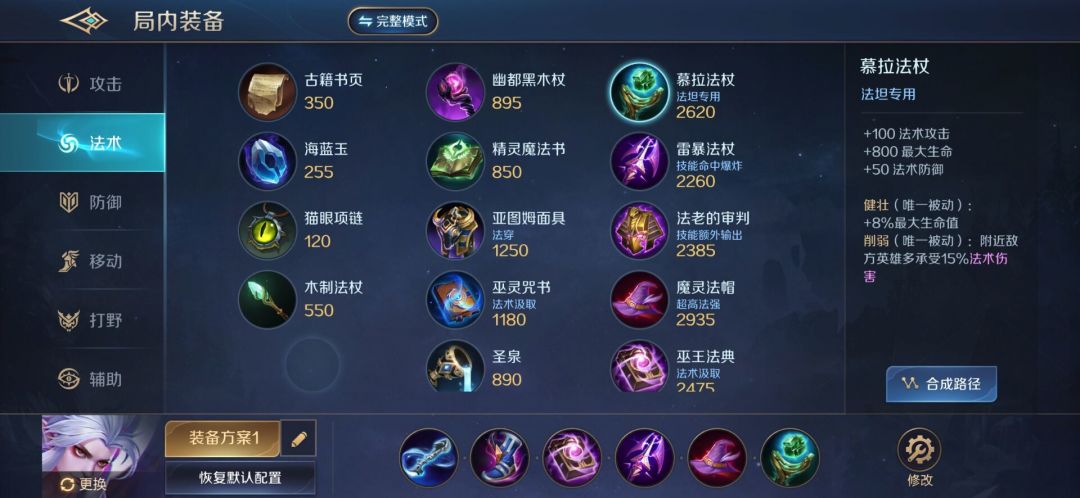 出门打野刀必不可少,鞋子推荐法穿,提供法穿,性价比很高,吸血保证了续航,雷暴法杖提供了移速加成,还有法球效果,大帽提供高额法强,配合慕拉法杖打出更多伤害,同时慕拉法杖还提供其他属性,性价比十足