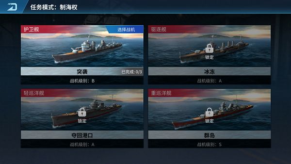 突袭、冰冻、夺回港口、群岛。每个任务有3个阶段,每个阶段为一个相应难度的关卡。游戏内每个任务显示的“已完成:0/3”即代表总共3个阶段,当前已完成第0个阶段。